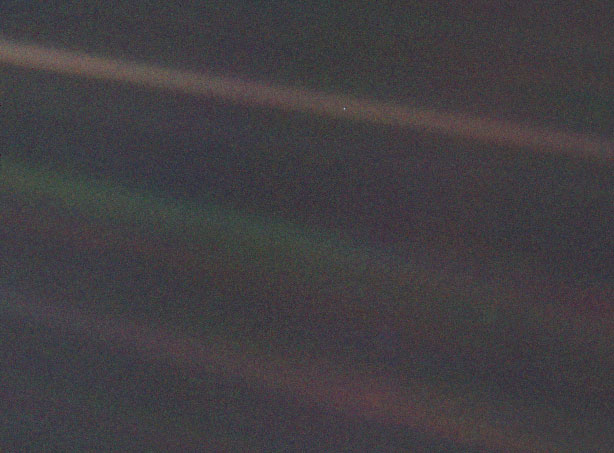 Un fir de praf pe o raza de soare… Poate ca aceste cuvinte traduc cel mai bine tot ce este scris mai sus in limba engleza. Nu, acest post nu este despre un trucaj ordinar; nu, este despre un fapt extraordinar. Un fapt petrecut acum 20 de ani, pe 4 februarie 1990. Voyager era pe cale sa paraseasca sistemul solar, dupa ce isi indeplinise misiunile timp de 13 ani, iar in acea zi NASA, la cererea speciala a lui Carl Sagan, a intors camera sondei pentru o ultima misiune si probabil cea mai grea dintre toate: sa faca o fotografie a Terrei, de la peste 6 mii de miliarde de kilometri distanta. Nimeni nu a stiu exact ce s-a intimplat cu acea fotografie decat cateva luni mai tirziu, cind informatia transmisa de Voyager a ajuns pe Pamint. Si iata ce a sosit.